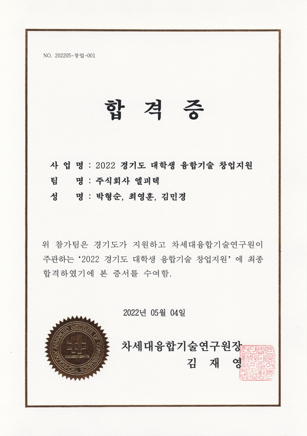 22년 경기도 대학생 융합기술 창업지원 합격증