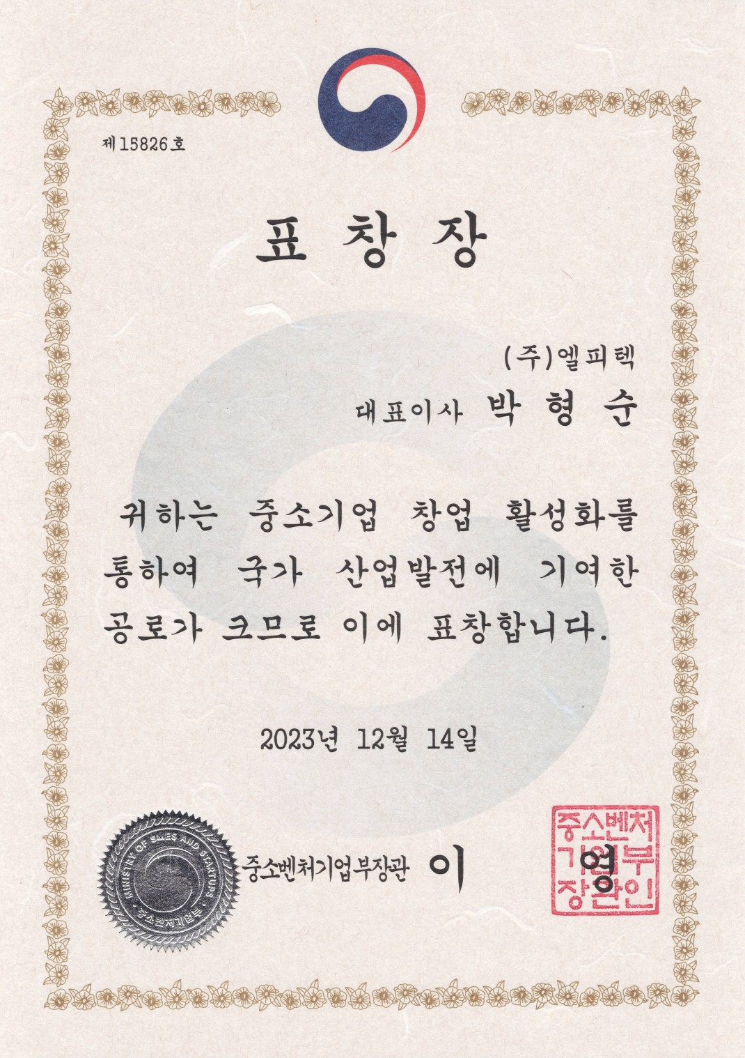 중소벤처기업부장관 표창장 > 인증서