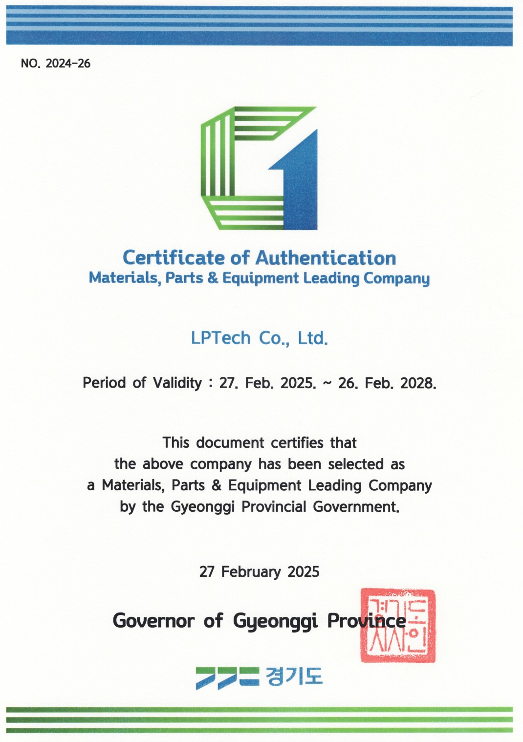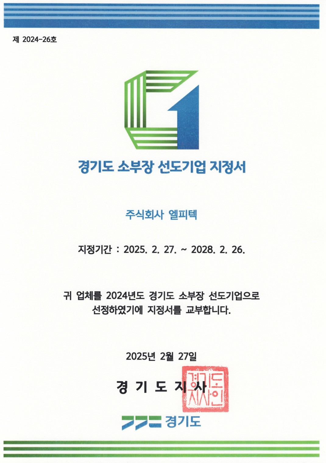 25년 경기도 소부장 선도기업 지정서