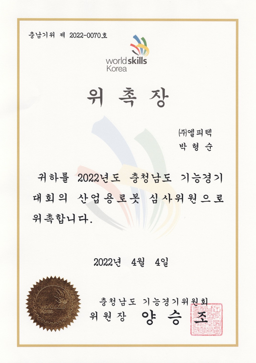 22년도 산업용로봇 직종 심사장 작성자최고관리자 등록일 22-06-16 조회1,051회 본문 22년도 충청남도 기능경기대회 산업용로봇 심사위원 위촉 연구개발전담부서 인정서 특허등록원부 목록