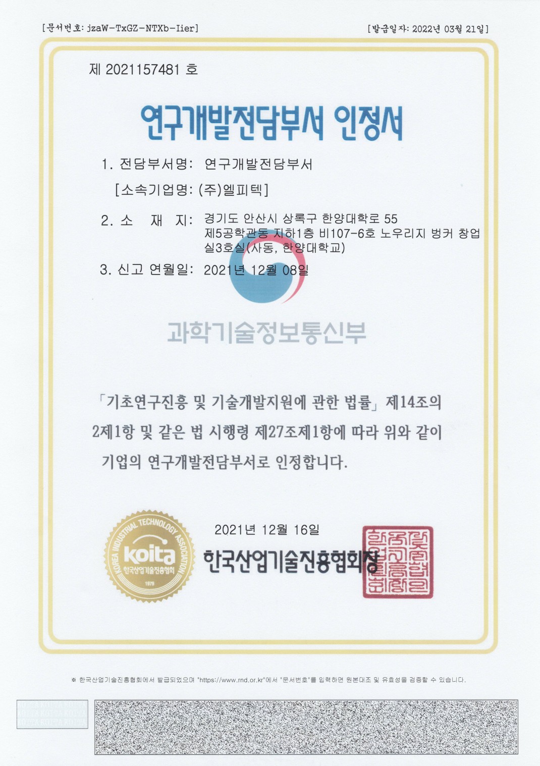 연구개발전담부서 인정서